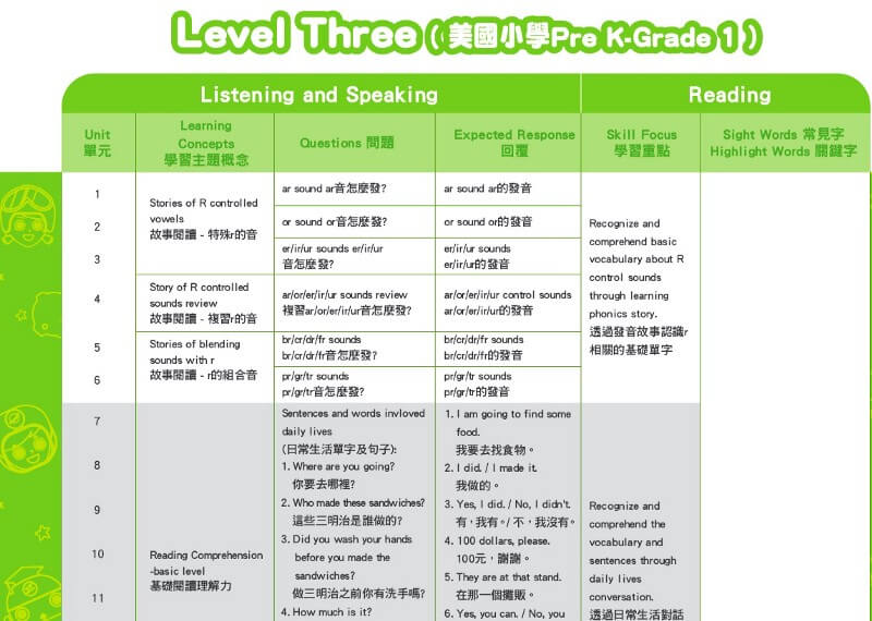 OiKID 程度測驗,會綜合聽、說、讀、寫四大能力做全面評估。確認出小朋友當前程度。Maya 程度測驗為 Level 4,顧問建議我們從 Level 3開始,由於這和她小一課後 ESL 的進度相當,我們也樂於接受。下面附上的是 OiKID 的 Level 3課表,依照課程安排,舉凡發音、閱讀、數學等,都在系統性的架構下,循序漸進多元的教授。